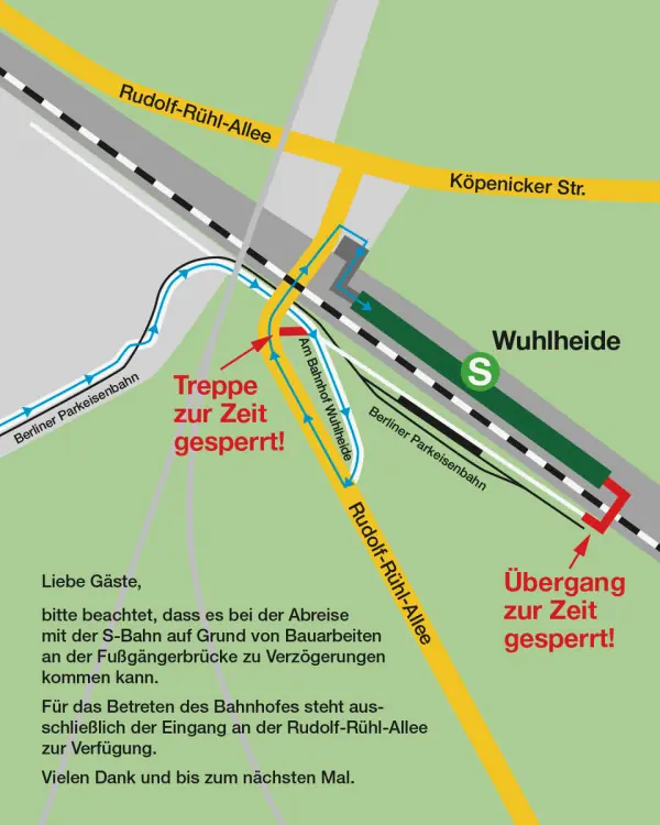 Bitte beachtet, dass es derzeit bei der Abreise mit der S-Bahn – aufgrund von Bauarbeiten an der Fußgängerbrücke – zu Verzögerungen kommen kann. Für das Betreten des Bahnhofs steht ausschließlich der Eingang an der Rudolf-Rühl-Allee zur Verfügung: